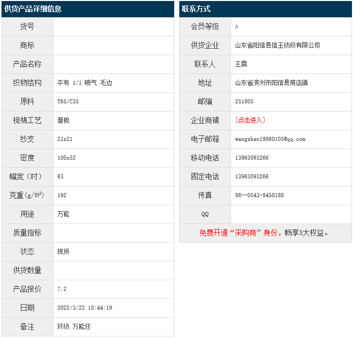3月22日,山東陽信縣信王紡織有限公司滌棉平布T65/C35 21x21 100x52 63" 1/1 192g/㎡ 噴氣 毛邊,報價為7.2元/米,實際成交價以協(xié)商為準。[點擊查看詳情]