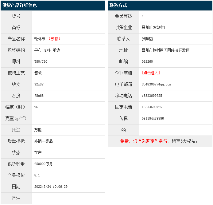 3月24日,晉州盼盈織布廠滌棉平布T50/C50 32x32 78x65 96" 劍桿 毛邊,報(bào)價(jià)為8.1元/米,實(shí)際成交價(jià)以協(xié)商為準(zhǔn)。[點(diǎn)擊查看詳情]