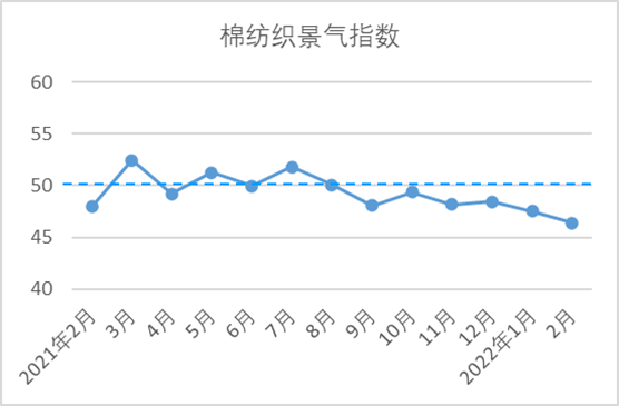 說明:中國棉紡織行業(yè)景氣指數采集自全國近500家次棉紡織企業(yè),參考國家制造業(yè)PMI等指數制定方式,通過對多個主要指標加權計算得出,當指數高于50,表示棉紡織行業(yè)本月景氣程度好于上月,低于50則表示本月景氣程度不及上月。