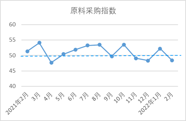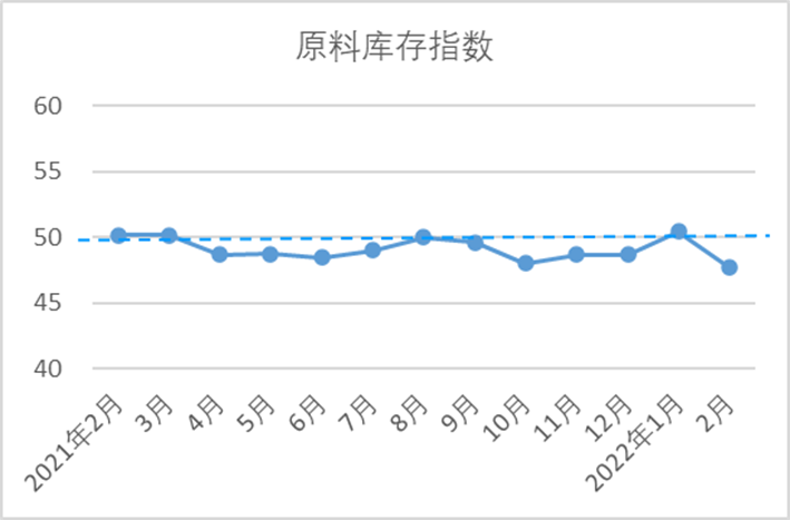 2月,原料采購指數48.36,較1月下降3.83,位于枯榮線下方。從市場價格看,在原油、農產品等價格上漲帶動下,春節(jié)后國內外棉價大幅走高。由于下游訂單不足,棉價失去上漲支撐,沖高后回落。非棉纖維方面,價格較1月大幅上漲。當月,代表國外棉花價格的CotlookA指數月平均值138.41美分/磅,環(huán)比上漲6.06美分/磅,漲幅4.58%;國內3128級棉花月均價22836元/噸,環(huán)比上漲176元/噸,漲幅0.78%;1.4D直紡滌綸短纖月均價7683元/噸,環(huán)比上漲266元/噸,漲幅3.59%;主流粘膠纖維月均價12928元/噸,環(huán)比上漲419元/噸,漲幅3.35%。從采購情況看,由于企業(yè)春節(jié)前進行補庫,且節(jié)后下游訂單不足,因此原料采購積極性不高,棉花及非棉纖維采購量指數均出現大幅下降,拉動原料采購指數下滑。