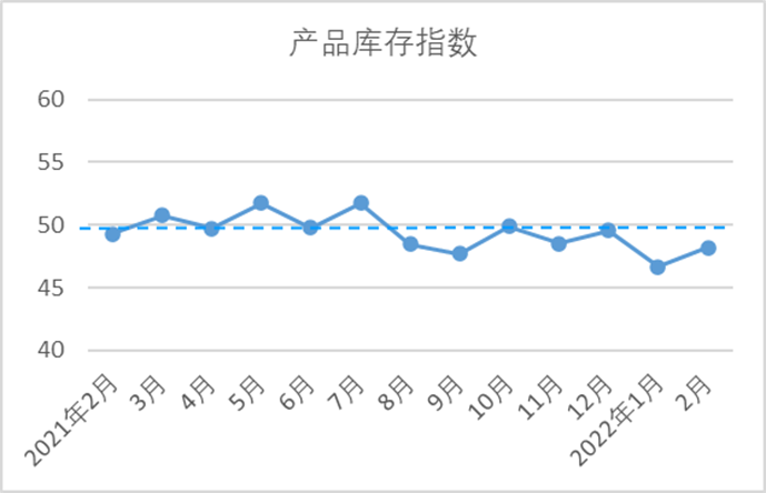 2月,產品庫存指數48.22,較1月上升1.54。初七開工后,下游客戶詢價相對比較積極,但實際簽單率不高,市場相比往年同期較為冷清。由于部分地區(qū)疫情散發(fā),企業(yè)貨物運輸也受到不同程度影響,產品庫存略有增加。從產品類別看,紗、布庫存量指數雖較1月上升,但均位于臨界點下方,處于收縮區(qū)間。其中紗庫存量指數為48.33,較1月上升2.12;布庫存量指數為48.05,較1月上升0.67。