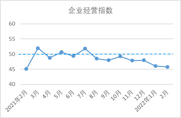 2月,企業(yè)經營指數45.79,較1月下降0.27,繼續(xù)位于枯榮線下方。今年春節(jié)后市場購銷緩慢,不及往年。上游原料價格繼續(xù)高位運行,企業(yè)生產成本持續(xù)增加,同時價格傳導不暢的格局未有改變,企業(yè)利潤繼續(xù)被擠壓,產品利潤率下降,經營壓力持續(xù)。調查數據顯示,表示主營業(yè)務收入下降的企業(yè)占比為65.35%,高于上升企業(yè)占比48.28個百分點;表示利潤總額下降的企業(yè)占比為59.47%,高于上升企業(yè)占比35.87個百分點。