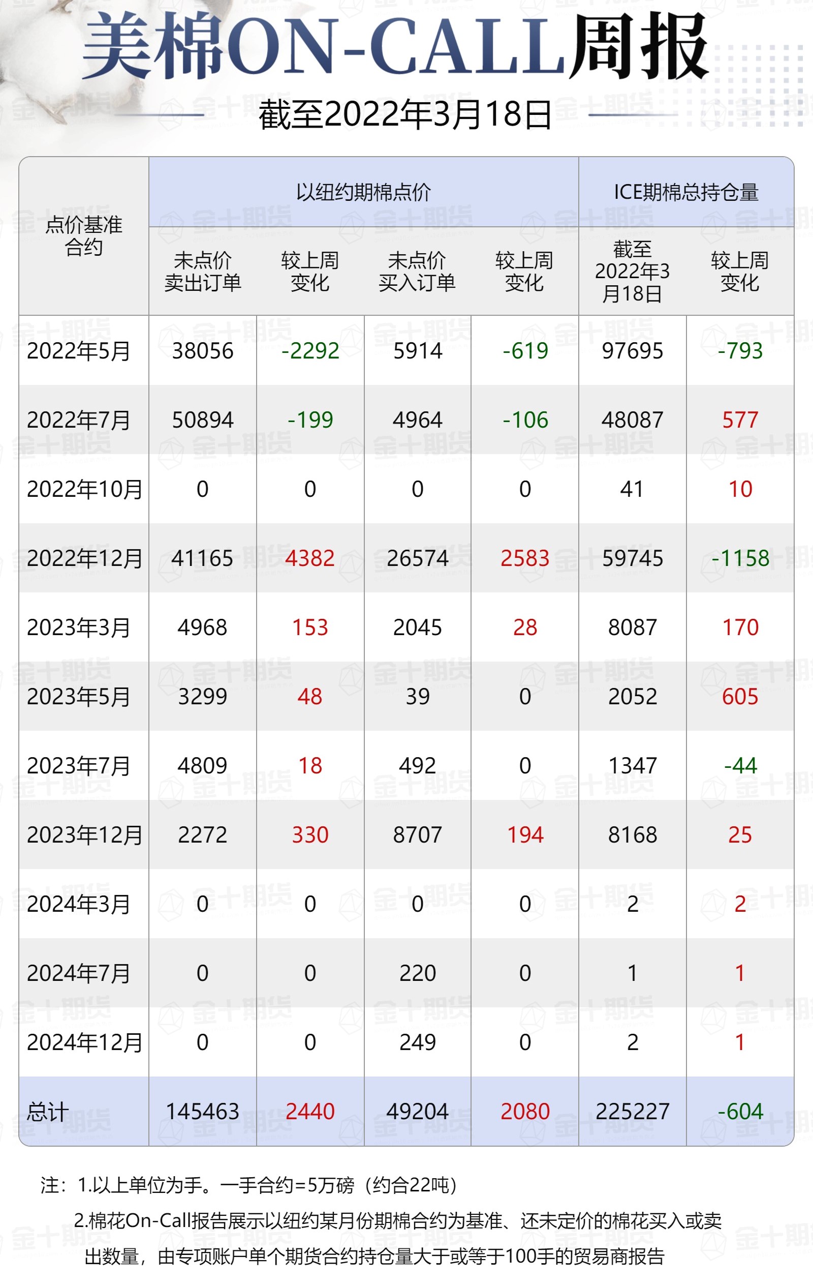 ①美棉On-Call未點(diǎn)價(jià)賣出訂單145463手,環(huán)比增加2440手;未點(diǎn)價(jià)買入訂單49204手,環(huán)比增加2080手;