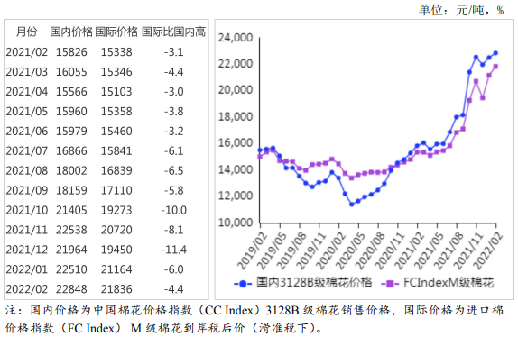 (一)國內(nèi)棉價環(huán)比上漲。本月,紡織企業(yè)節(jié)后開工普遍較早,隨著原料庫存逐漸消耗,企業(yè)采購意愿有所增強,推動國內(nèi)棉價繼續(xù)上漲。據(jù)《中國棉花工業(yè)庫存調(diào)查報告》數(shù)據(jù),2022年2月企業(yè)棉花平均庫存使用天數(shù)約34.3天,環(huán)比增加2.5天,同比減少16.6天,比近5年同期平均水平減少6.6天。準(zhǔn)備采購原料企業(yè)占56.7%,環(huán)比增加6.7個百分點,同比增加5.9個百分點。2月國內(nèi)3128B級棉花月均價每噸22848元,環(huán)比漲1.5%,同比漲44.4%。鄭棉期貨主力合約(CF205)月結(jié)算價每噸21506元,環(huán)比漲0.7%,同比漲35.4%。