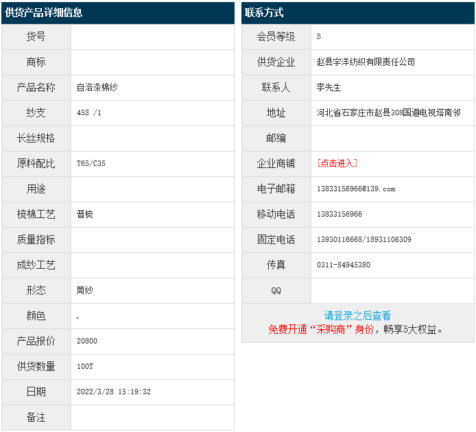 3月28日,趙縣宇洋紡織有限責(zé)任公司自絡(luò)滌棉紗T65/C35 45S,報價為20800元/噸,實際成交價以協(xié)商為準(zhǔn)。[點擊查看詳情]