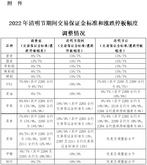 根據(jù)《鄭州商品交易所期貨交易風(fēng)險(xiǎn)控制管理辦法》第九條規(guī)定,經(jīng)研究決定,對(duì)2022年清明節(jié)期間部分期貨合約交易保證金標(biāo)準(zhǔn)和漲跌停板幅度作出如下調(diào)整: