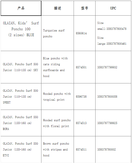 此次召回產(chǎn)品為OLAIAN的兒童斗篷,有各種顏色和款式。具體召回產(chǎn)品信息如下: