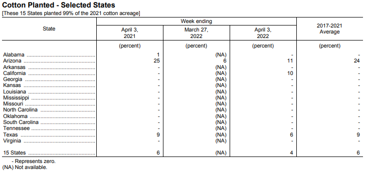 美國農(nóng)業(yè)部4月4日發(fā)布的美國棉花生長報告顯示,截至4月3日當周,美棉種植率為4%,去年同期為6%,五年均值為6%。
