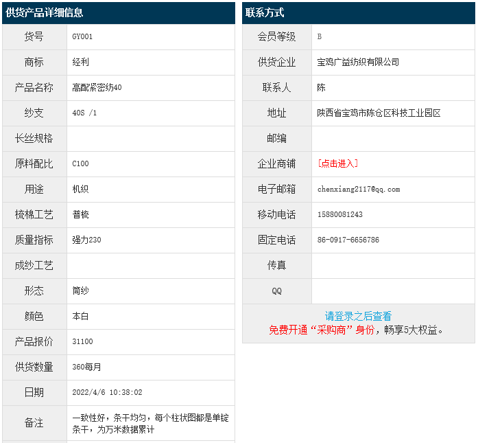 4月6日,寶雞廣益紡織有限公司機(jī)織用高配緊密紡純棉紗C100 40S 強(qiáng)力230 本白,報(bào)價(jià)為31100元/噸,實(shí)際成交價(jià)以協(xié)商為準(zhǔn)。[點(diǎn)擊查看詳情]