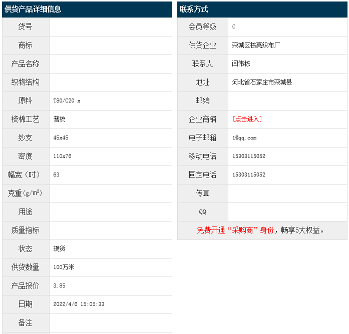 4月6日,欒城區(qū)棟亮織布廠滌棉布T80/C20 45x45 110x76 63",報(bào)價(jià)為3.85元/米,實(shí)際成交價(jià)以協(xié)商為準(zhǔn)。[點(diǎn)擊查看詳情]