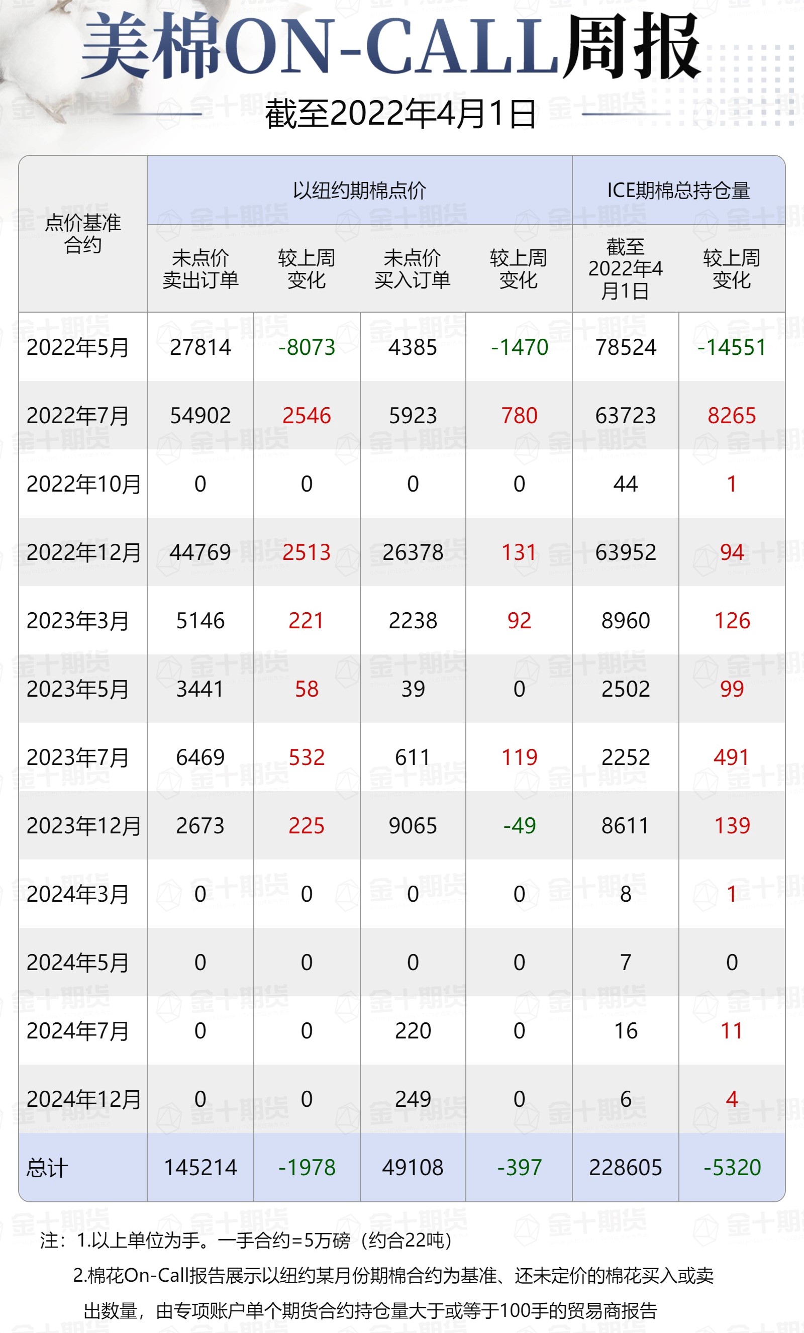①美棉On-Call未點價賣出訂單145214手,環(huán)比減少1978手;未點價買入訂單49108手,環(huán)比減少397手;