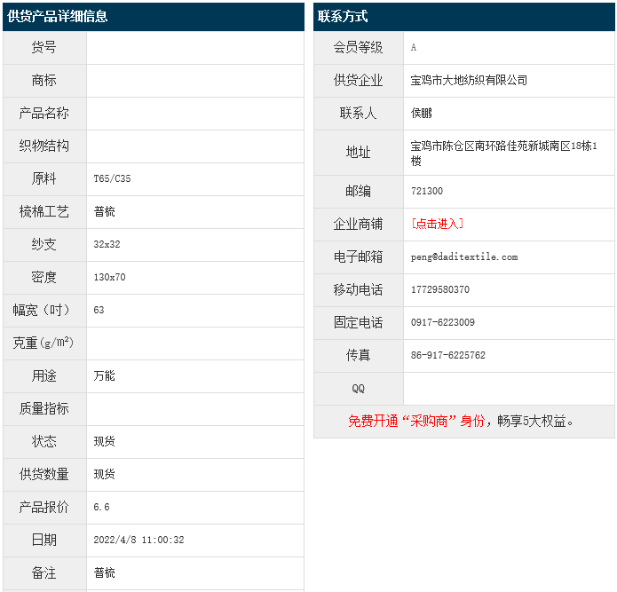 4月8日,寶雞大地紡織有限公司滌棉布T65/C35 32x32 130x70 63",報價為6.6元/米,實際成交價以協(xié)商為準(zhǔn)。[點擊查看詳情]