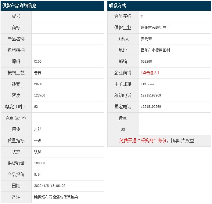 4月8日,晉州云峰織布廠純棉布C100 20x16 128x60 63",報價為8.6元/米,實際成交價以協(xié)商為準(zhǔn)。[點擊查看詳情]