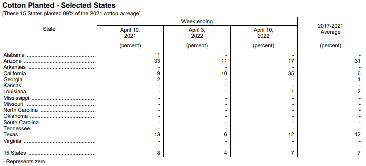 美國(guó)農(nóng)業(yè)部4月11日發(fā)布的美國(guó)棉花生長(zhǎng)報(bào)告顯示,截至4月10日當(dāng)周,美棉種植率為7%,前周為4%,去年同期為8%,5年均值為7%。