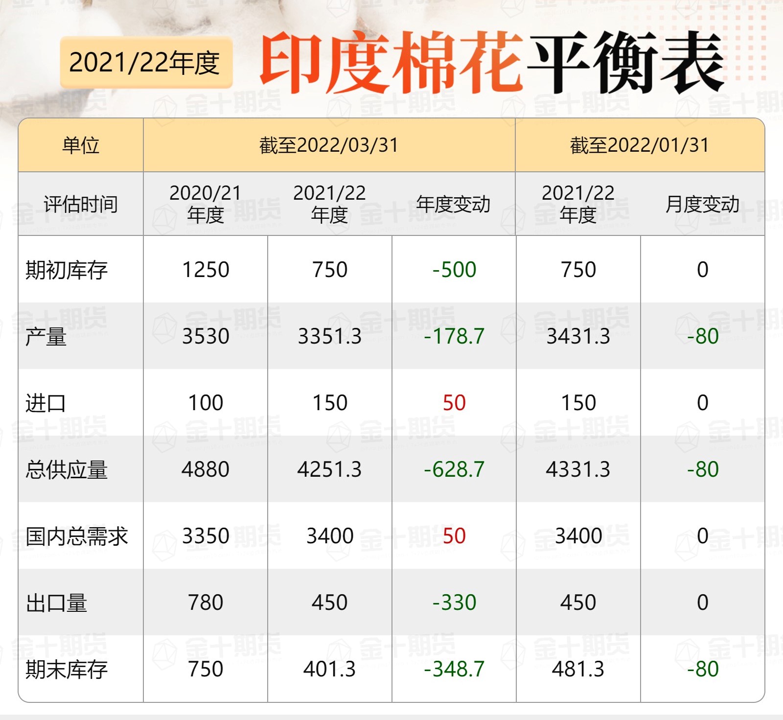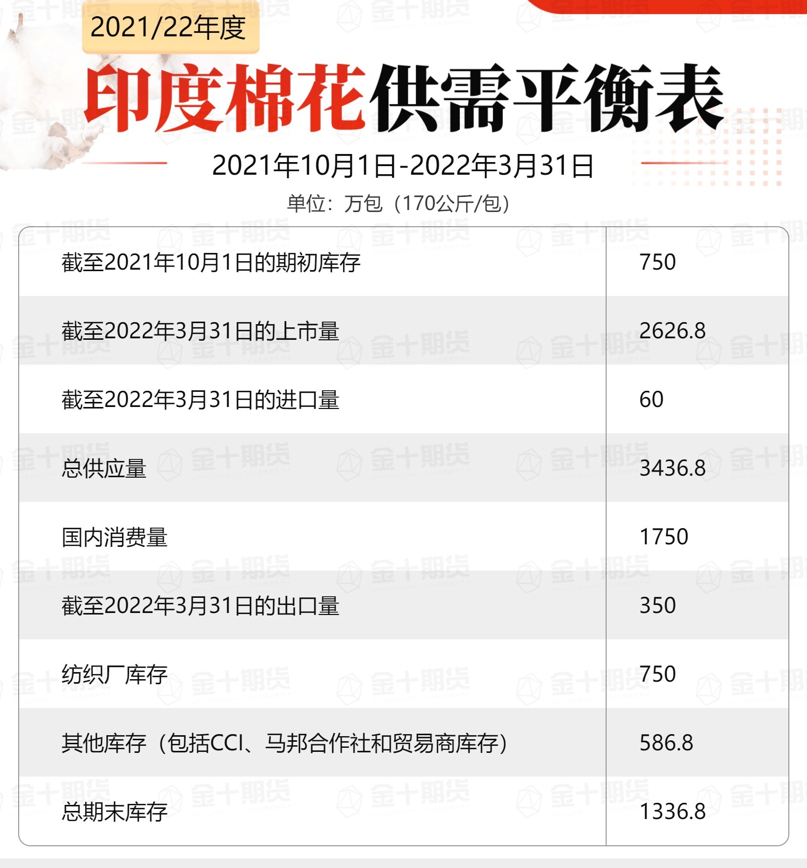 CAI表示,2021年10月到2022年3月棉花供應總量估計為3436.8萬包,其中包括2626.8萬包自產(chǎn)、60萬包進口、期初庫存預估750萬包。此外同期棉花消費量預計為1750萬包,出口量估計為350萬包。