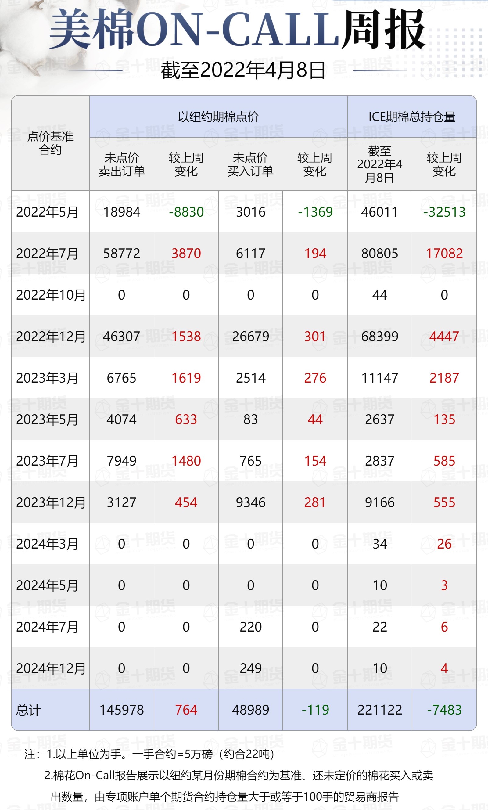 ①美棉On-Call未點(diǎn)價賣出訂單145978手,環(huán)比增加764手;未點(diǎn)價買入訂單48989手,環(huán)比減少119手;