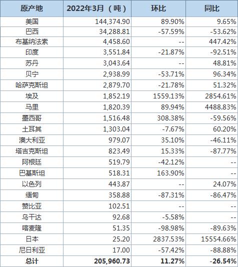 據(jù)海關(guān)統(tǒng)計(jì)數(shù)據(jù),2022年3月我國(guó)進(jìn)口棉花約21萬(wàn)噸,環(huán)比增長(zhǎng)約2萬(wàn)噸,同比下降約26.5%。