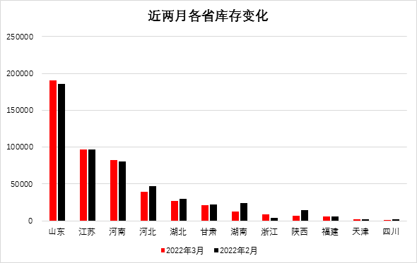 分省份看,山東省庫存量居首位為19.1萬噸,江蘇省次之為9.71萬噸,河南省居第三位為8.25萬噸,河北省為3.97萬噸,湖北省為2.68萬噸,湖南省1.28萬噸,其他省均在1萬噸以下。