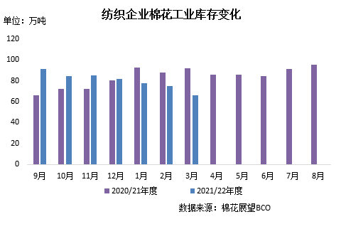 由于紡紗利潤虧損幅度持續(xù)擴大,疊加下游需求低迷,企業(yè)觀望情緒濃厚,備貨意愿也持續(xù)較弱,只能不斷壓縮原料庫存,以減輕成本和資金流壓力。截至3月31日紡織企業(yè)在庫棉花工業(yè)庫存量66.45萬噸,較上月底減少8.66萬噸,同比減少25.3萬噸。其中38%企業(yè)減少棉花庫存,18%增加庫存,44%基本保持不變。