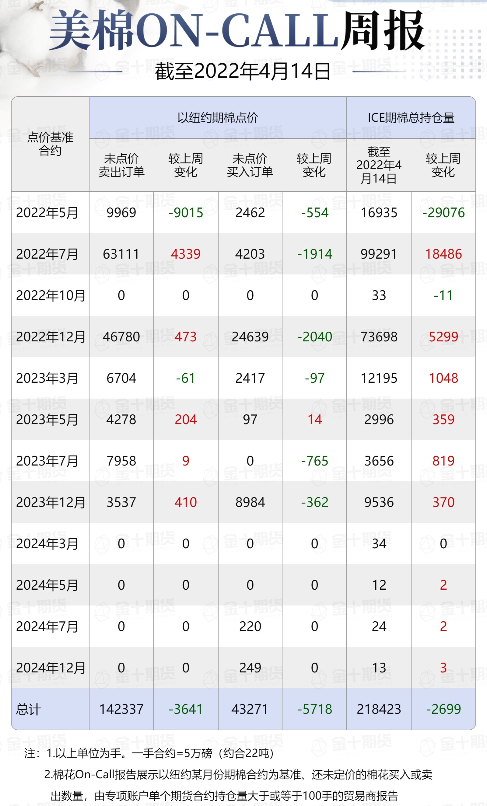 ①美棉On-Call未點(diǎn)價(jià)賣(mài)出訂單142337手,環(huán)比減少3641手;未點(diǎn)價(jià)買(mǎi)入訂單43271手,環(huán)比減少5718手;