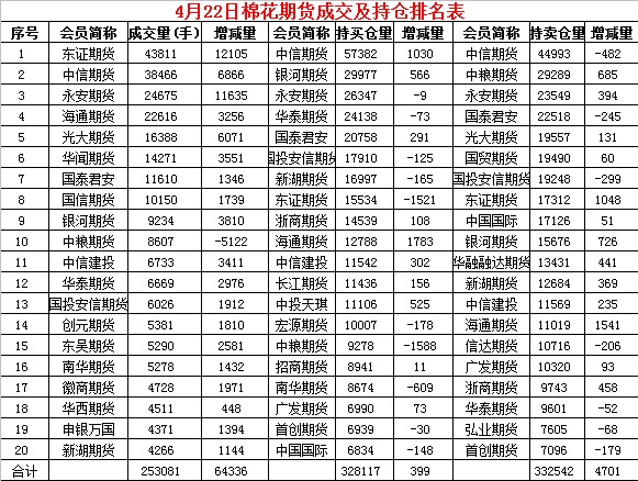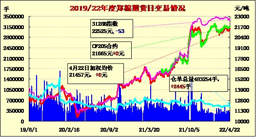 4月22日,隔夜鄭棉沖高,今日早盤在空頭賣盤與多頭平倉壓制下回落,盤中反復(fù)震蕩,午后重心略有下移,日線形成低開陽線星,遠(yuǎn)期合約成交量放大,持倉量增加。本周美棉簽約量再度減少,仍有部分國家取消前期簽約,裝運(yùn)有所恢復(fù)。4.8-4.14日一周美國2021/22年度陸地棉凈簽約11453噸,較前一周減少15%,較近四周平均大幅減少70%;裝運(yùn)2021/22 年度陸地棉83257噸,較前一周增加10%,較近四周平均減少6%。凈簽約本年度皮馬棉862噸,較前一周大幅增加79%;裝運(yùn)皮馬棉3334噸,較前一周減少19%。新年度陸地棉簽約30867噸,皮馬棉簽約1247噸。