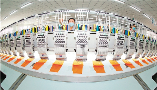4月27日,青島市即墨區(qū)一家公司的繡花工人在生產(chǎn)出口到海外市場的服裝產(chǎn)品。今年以來,山東省青島市即墨區(qū)的紡織服裝生產(chǎn)企業(yè)訂單充足,產(chǎn)能飽滿,工人們加緊趕制海外訂單,滿足國際市場需求。據(jù)悉,即墨區(qū)擁有紡織服裝企業(yè)3000余家,是集研發(fā)、設(shè)計、生產(chǎn)、出口于一體的區(qū)域性紡織服裝產(chǎn)業(yè)基地。