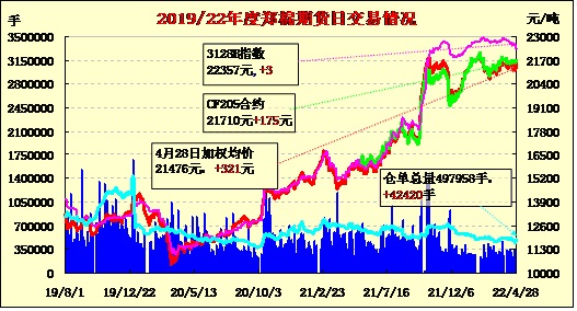 4月28日,隔夜鄭棉高開增倉上行,今日早盤高位震蕩,午后在多頭買盤推動(dòng)下收于日高,日線形成長陽線。日內(nèi)成交量成倍放大,持倉量大幅增加。在美棉供需偏緊格局不變的背景之下,雖然目前美棉播植進(jìn)度暫時(shí)正常,但受旱情影響或面臨種的多收的少的局面,市場對新年度供應(yīng)的擔(dān)憂持續(xù)對棉價(jià)運(yùn)行形成支撐。美棉周度出口數(shù)據(jù)發(fā)布在即,近幾周有部分國家大量取消前期簽約,市場普遍關(guān)注新周簽約數(shù)據(jù)變化情況。