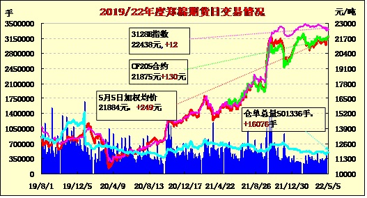 5月5日,勞動節(jié)期間ICE棉花期貨上漲,今日鄭棉在外棉上漲帶動下高開,隨后高位橫盤,日線形成高開小陰線。日內(nèi)成交量清淡,持倉量增加。美聯(lián)儲公布議息會議結(jié)果,即宣布加息50個基點(diǎn)并于六月開始漸進(jìn)式縮表,且基本上排除了接下來鷹派加息的可能,整體符合市場預(yù)期,因此或已提前消化利空因素。近日美國啟動對華加征關(guān)稅復(fù)審程序,或考慮降低對自行車、服裝等中國輸美商品加征的關(guān)稅,以幫助抑制飆升的物價。