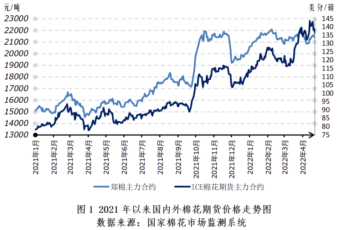 時至4月,棉價高位運行與下游走弱持續(xù)背離,國內(nèi)紡織行業(yè)持續(xù)降溫態(tài)勢進一步加劇,疊加奧密克戎變異毒株擴散,清明節(jié)過后,部分紡織廠延長放假時間,減產(chǎn)、停產(chǎn)成為普遍現(xiàn)象,我們在2021年9月初的《中國棉花市場周報》中曾提到,“下游棉紗價格開始松動,旺季不旺特征將逐漸顯現(xiàn)?!闭缥覀冾A期,2021年紡織“金九銀十”旺季落空,年底進一步轉(zhuǎn)淡,2022年春節(jié)后降溫更加明顯。當前國內(nèi)棉價走勢整體呈現(xiàn)弱于國際、強于下游的態(tài)勢。截至2022年4月底,代表內(nèi)地標準級皮棉市場價格的國家棉花價格B指數(shù)22387元/噸,較3月底下跌0.84%,鄭州商品交易所棉花期貨主力合約結(jié)算價21655元/噸,較3月底下跌1.17%。