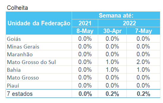 據(jù)巴西農(nóng)業(yè)部下屬的國(guó)家商品供應(yīng)公司CONAB,截至5月7日,巴西棉花收割率為0.2%,上周為0.2%,去年同期為0%。