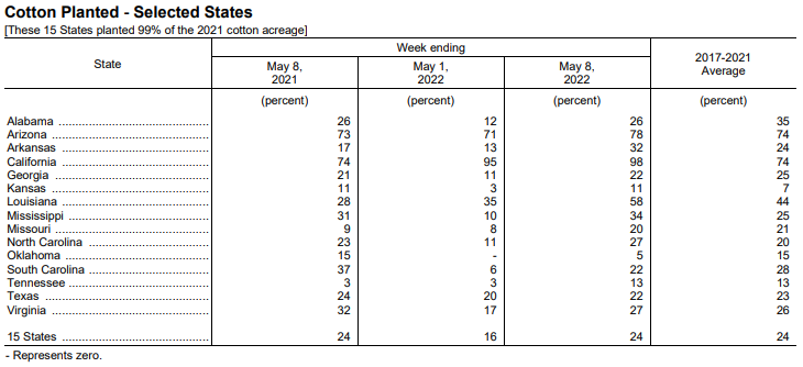 美國農(nóng)業(yè)部5月9日發(fā)布的美國棉花生長報告顯示,截至5月8日當周,美棉種植率為24%,前周為16%,去年同期為24%,5年均值為24%。