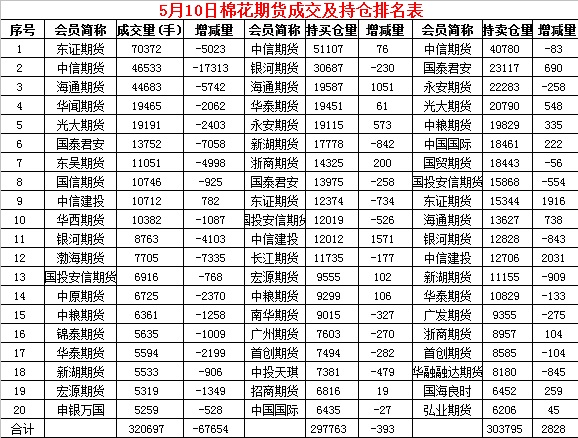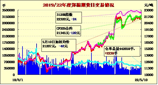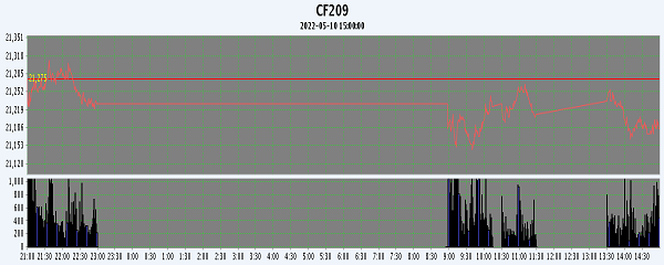 5月10日,隔夜鄭棉高開反彈后回落,今日早盤在空頭賣盤壓制下走低,隨后空頭回補支撐期價反彈,午后盤整,尾盤回落,日線形成高開陰線。日內(nèi)成交量萎縮,持倉量略有減少。