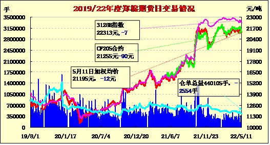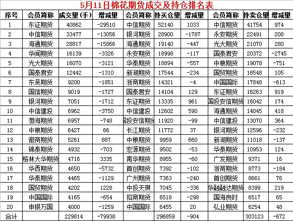 5月11日,隔夜鄭棉增倉(cāng)下探,今日早盤在空頭回補(bǔ)盤支撐下回穩(wěn),午后上沖回落,日線形成小陽(yáng)線。日內(nèi)成交量萎縮,持倉(cāng)量略有減少。