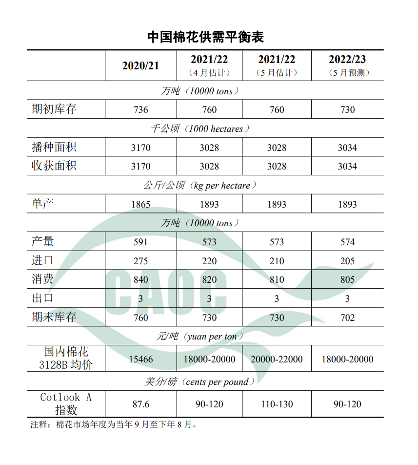 本月預(yù)測(cè),2022/23年度,中國(guó)棉花播種面積為3034千公頃(4551萬(wàn)畝),較上年度增0.2%。2021年籽棉收購(gòu)價(jià)格創(chuàng)近十年來(lái)高位,加上2022年新疆繼續(xù)實(shí)行棉花目標(biāo)價(jià)格政策,棉農(nóng)植棉積極性較高。全國(guó)棉花播種出苗期間綜合氣候適宜,預(yù)計(jì)棉花單產(chǎn)每公頃1892公斤(每畝126公斤),與上年度持平。棉花產(chǎn)量為574萬(wàn)噸,較上年度增0.2%。俄烏沖突拖累全球經(jīng)濟(jì)復(fù)蘇進(jìn)程放緩,市場(chǎng)對(duì)棉花消費(fèi)恢復(fù)預(yù)期減弱,預(yù)計(jì)新年度中國(guó)棉花消費(fèi)量為805萬(wàn)噸,較上年度減少5萬(wàn)噸,進(jìn)口量較上年度調(diào)減5萬(wàn)噸至205萬(wàn)噸,期末庫(kù)存降至702萬(wàn)噸。