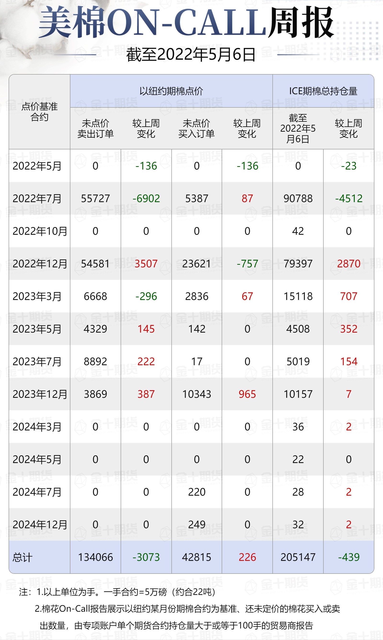 ①美棉On-Call未點(diǎn)價(jià)賣出訂單134066手,環(huán)比減少3073手;未點(diǎn)價(jià)買入訂單42815手,環(huán)比增加226手;