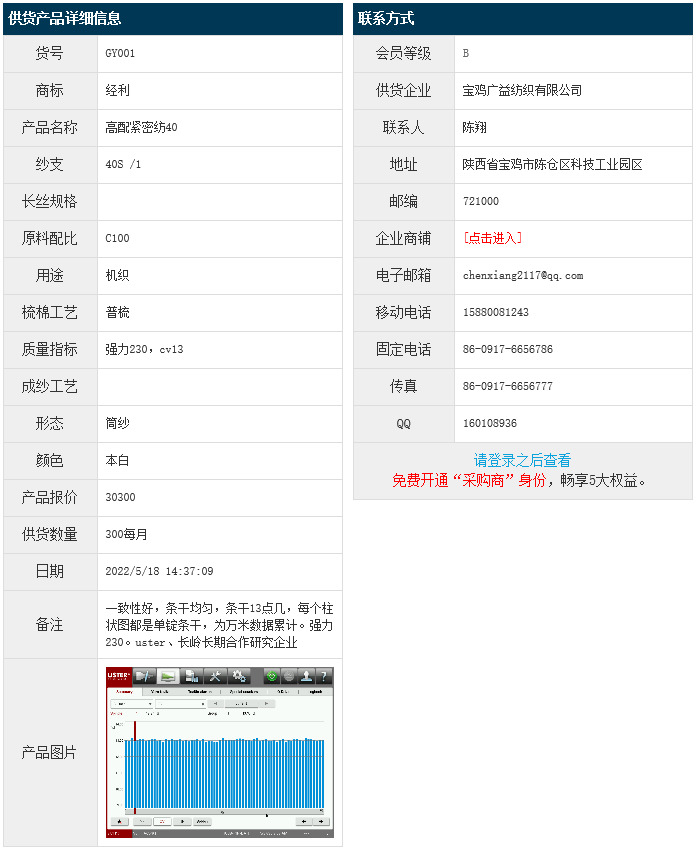 5月18日,寶雞廣益紡織有限公司機(jī)織高配緊密紡純棉紗C100 40S 強(qiáng)力230 cv13,報價為30300元/噸,實際成交價以協(xié)商為準(zhǔn)。[點擊查看詳情]
