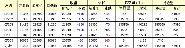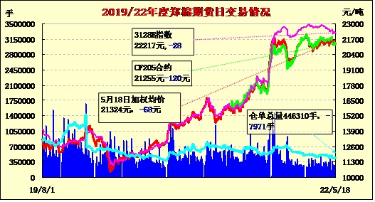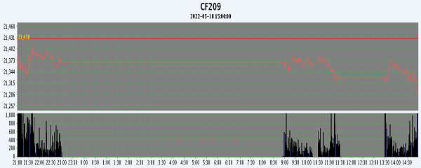 5月18日,周二紐約棉花期貨收跌,隔夜鄭棉低開盤整,今日早盤維持橫盤,午后在平倉盤壓制下走低,日線形成小有線。日內(nèi)成交量萎縮,持倉量減少。