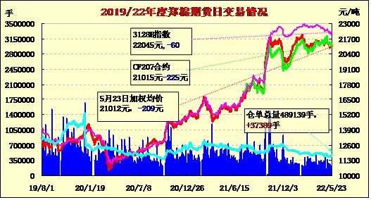 5月23日,上周五紐約棉花期貨大幅收跌,隔夜鄭棉低開(kāi)盤整,今日早盤在空頭賣盤增倉(cāng)打壓下走低,盤中低位震蕩,午后在空頭回補(bǔ)盤支撐下脫離低點(diǎn),日線形成長(zhǎng)陰線。日內(nèi)成交量放大,持倉(cāng)量增加。
