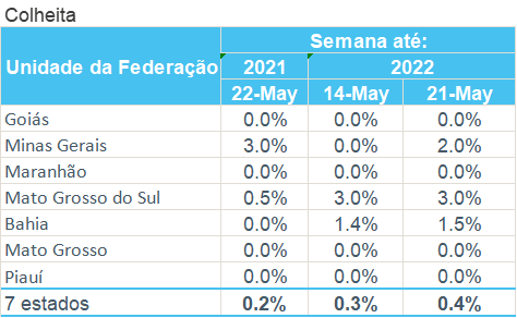 據(jù)巴西農(nóng)業(yè)部下屬的國家商品供應(yīng)公司CONAB,截至5月21日,巴西棉花收割率為0.4%,上周為0.3%,去年同期為0.2%。