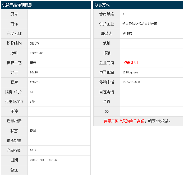 5月24日,紹興亞信紡織品有限公司粘/天絲騎兵斜R70/TS30 30x30 120x76 63" 170g/㎡,報價為10.2元/米,實際成交價以協商為準。[點擊查看詳情]