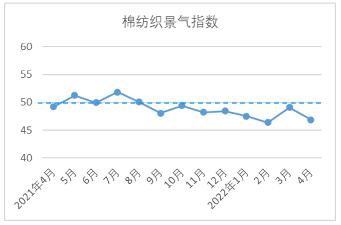 4月,生產指數47.14,較3月下降2.79,位于枯榮線下方。當月,國內部分地區(qū)疫情散發(fā),加上下游市場需求不足,企業(yè)生產受到一定影響,部分企業(yè)開機下調或停產。4月,企業(yè)開機/臺率指數46.85,低于臨界點。從產品產量看,紗、布產量均環(huán)比下降,一些企業(yè)開始轉換品種,加大化纖產品比例,盡力將風險降到最低。4月,紗產量指數47.76,較3月下降5.8;布產量指數為46.97,較3月下降5.46。