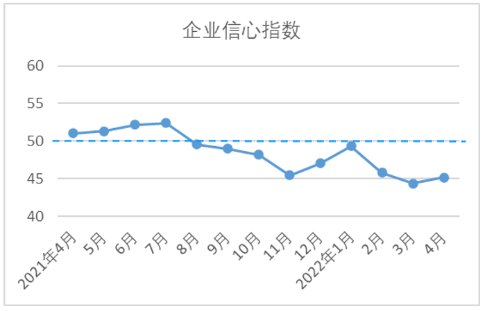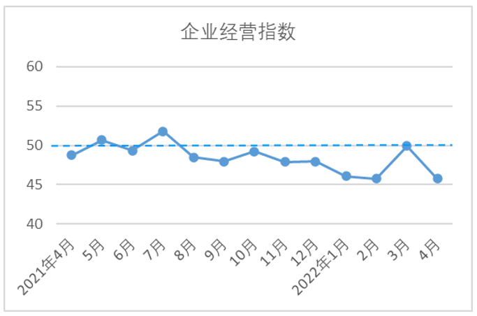 4月,企業(yè)經營指數45.74,較3月下降4.17,位于枯榮線下方。4月,受到疫情及俄烏戰(zhàn)爭等因素持續(xù)影響,原料端價格持續(xù)高位運行,上下游價格傳導明顯不暢,產業(yè)鏈供應鏈存在一些堵點。同時交通物流受阻,運輸費用增加,企業(yè)生產經營面臨較大壓力。當月,主營業(yè)務收入指數45.67,較3月下降5.3;利潤總額指數45.81,較3月下降3.04。