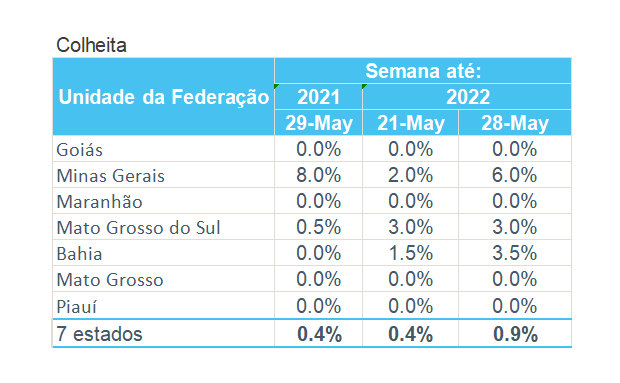 據(jù)巴西農(nóng)業(yè)部下屬的國(guó)家商品供應(yīng)公司CONAB,截至5月28日,巴西棉花收割率為0.9%,上周為0.4%,去年同期為0.4%。