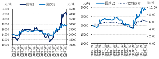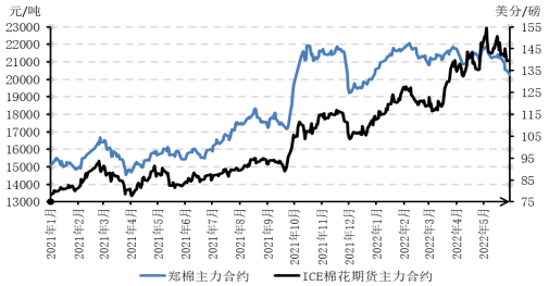 “五一”假期過后,國內(nèi)棉花加工企業(yè)去庫存意愿有所增強(qiáng),由于下游紡織市場低迷態(tài)勢未改,部分紡織企業(yè)延長放假時(shí)間,棉紗拋售時(shí)有發(fā)生,國內(nèi)棉價(jià)明顯下跌。截至2022年5月底,代表內(nèi)地標(biāo)準(zhǔn)級皮棉市場價(jià)格的國家棉花價(jià)格B指數(shù)21529元/噸,較4月底下跌3.8%,鄭州商品交易所棉花期貨主力合約結(jié)算價(jià)為20265元/噸,較4月底下跌6.4%。