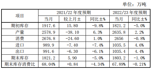 表3 中國棉花產(chǎn)銷存預(yù)測(2022年5月預(yù)測)
