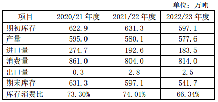 5月國家棉花市場監(jiān)測系統(tǒng)還首次發(fā)布2022/23年度中國棉花產(chǎn)銷存預(yù)測,根據(jù)全國植棉意向調(diào)查預(yù)測,2022/23年度全國棉花產(chǎn)量預(yù)計(jì)577.6萬噸,同比下降0.43%,在疫情趨穩(wěn),不發(fā)生重大事件前提下,棉花消費(fèi)量預(yù)計(jì)為814萬噸,同比增長1.2%,庫存消費(fèi)比為66.34%,較上年下降7.76個(gè)百分點(diǎn)。
