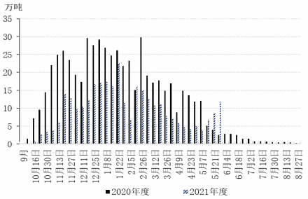 圖5 2020年度和2021年度新棉周度銷售進(jìn)度對比