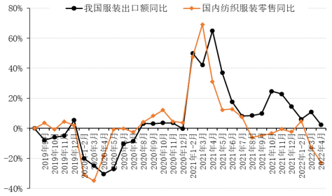 圖6 2019年度以來我國服裝內(nèi)外需同比增速變化