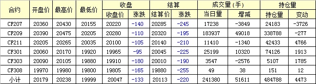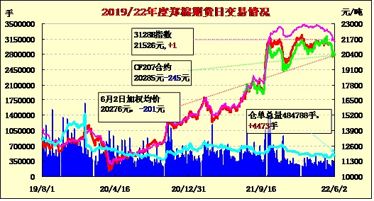 6月2日,隔夜鄭棉低開反彈后震蕩盤跌,今日早盤在空頭賣盤壓制下震蕩下行,午后受到空頭回補(bǔ)支撐止跌震蕩,日線形成小陰線。日內(nèi)成交量放大,持倉量略有減少。