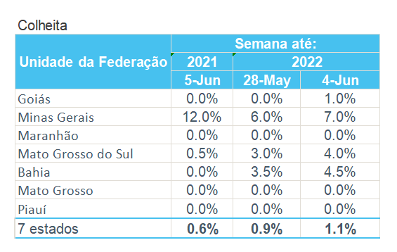 據(jù)巴西農(nóng)業(yè)部下屬的國(guó)家商品供應(yīng)公司CONAB,截至6月4日,巴西棉花收割率為1.1%,上周為0.9%,去年同期為0.6%。